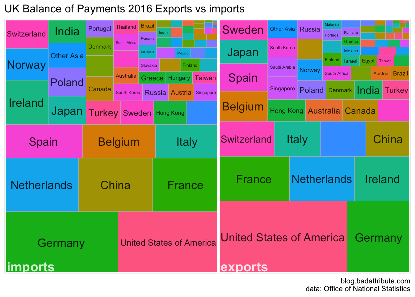 labs(title = "UK Balance of Payments 2016 Exports vs imports", caption ="blog.badattribute.com\ndata: Office of National Statistics") +